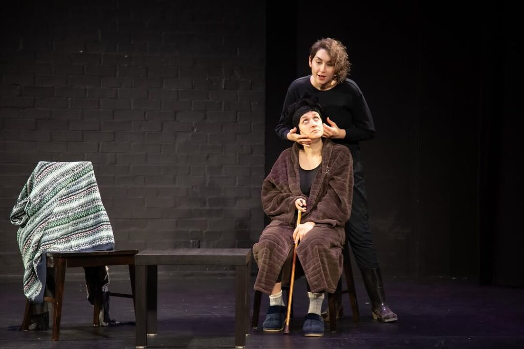 مگ مادر پیر و نزاری است که مدت ها دختر میانسال خود را در خانه نگه داشته و مانع از روابط اجتماعی و سالم او در خارج از خانه می شود. رابطه مادر-دختر ترکیبی از عشق و نفرت است که لبه نفرت به وضوح سنگینی می کند. بازی جسورانه هر دو بازیگر در نمایش این تنش را به خوبی به تماشاگران منتقل میکند. در بخشی از نمایش مورین ابتدا موهای مادر را نوازش می دهد اما اندک اندک به سوی گردن او رفته و آماده خفه کردن اوست. این خشونت با فضای نمایش مکدونا و انتهای آن تناسب خوبی داشت و در رفتارهای مگ و مورین به وضوح دیده می شد. گرچه هر دو بازیگر توانستند به خوبی از عهده دیالوگ های بعضا پیچیده و اکت های خشن برآیند، اما کمبود تحرک و بازی در شخصیت مادر باعث شد ماجرای مردی که به خانه آمده بود و نامه مهمی که احتمالا آورده بود و مادر پنهان کرده بود به حاشیه برود. شاید بهتر است بگوییم بازیِ برجسته و پویایِ مورین (دخترِ میانسال) و استفاده حداکثریِ او از دکورِ ساده نمایش باعث به محاق رفتن داستان و شخصیت مگی (مادر) شده بود. (3/5)